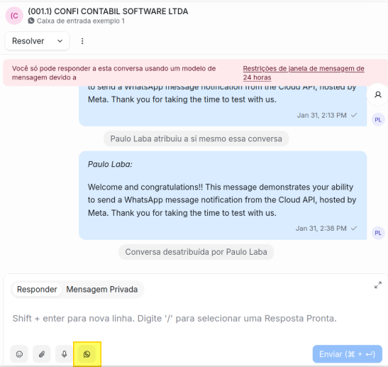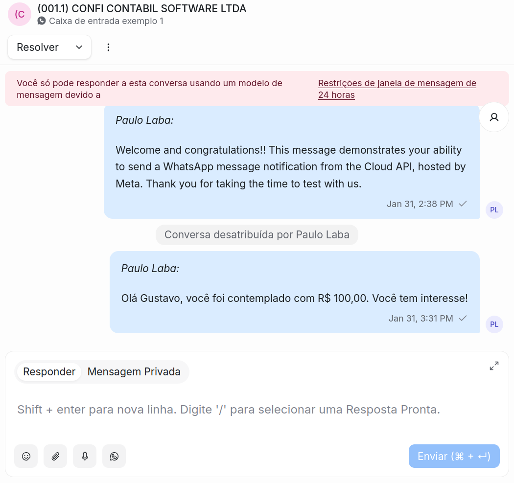 Figura 3 - Conversa de caixa de entrada de Whatsapp Oficial. Observe que como a última conversa foi iniciada a mais de 24h, você deve iniciar uma nova conversa enviando um template de mensagem (mensagens livres não são habilitadas nesse caso).