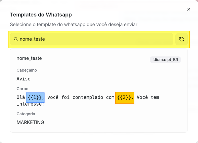 Observação: Caso um template aprovado não esteja visível na lista, clique no ícone de atualizar para sincronização das mensagens modelo junto à META. Esta ação pode levar alguns segundos.