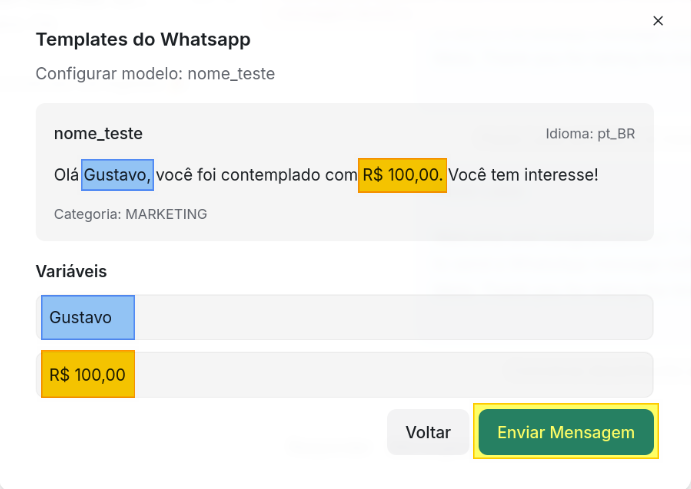 Figura 5 - Interface de preenchimento das variáveis do template. Nesse exemplo, o template de mensagem nome_teste tem duas variáveis de tipo texto. Observe que essa interface já mostra em tempo real uma visualização de como a mensagem ficará após substituir os valores que informamos nas variaǘeis.