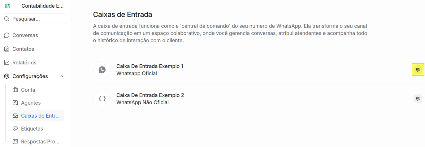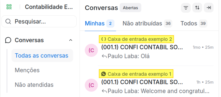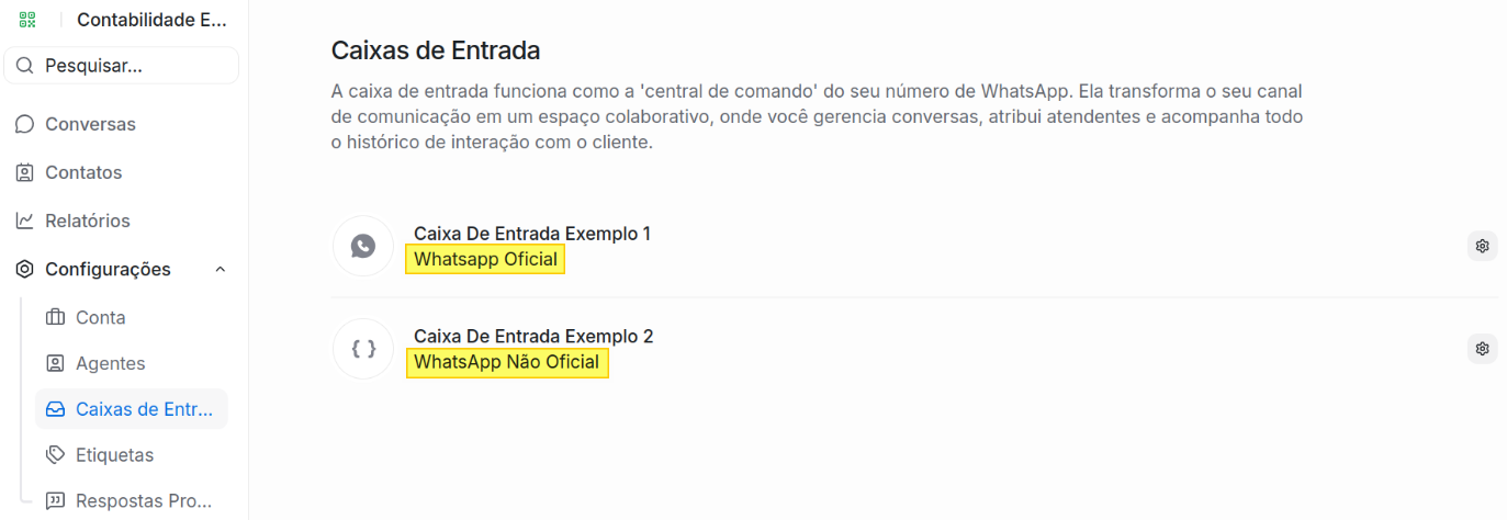 No exemplo abaixo, a contabilidade tem duas caixas de entrada, uma utilizando o "Whatsapp Oficial" e outra o "Whatsapp Não Oficial".