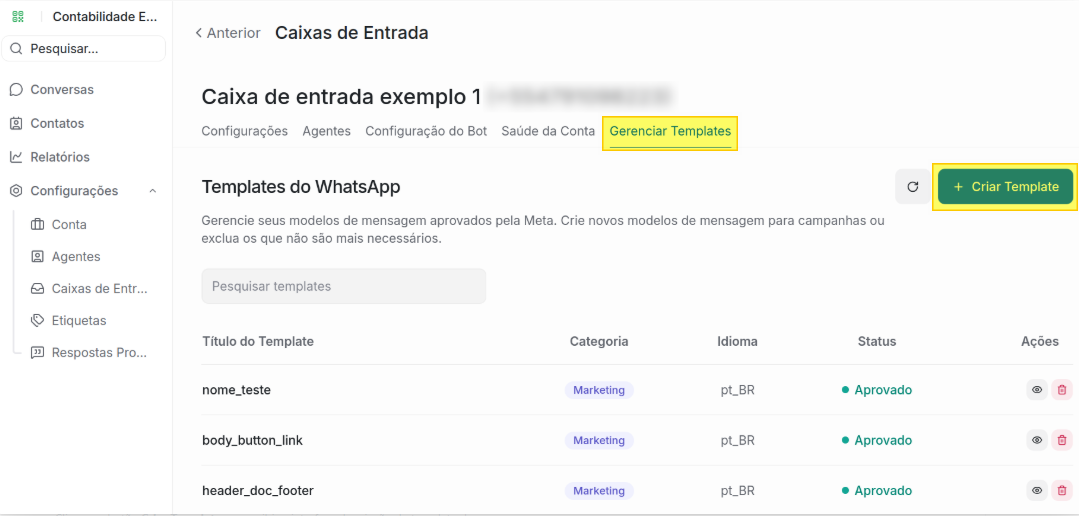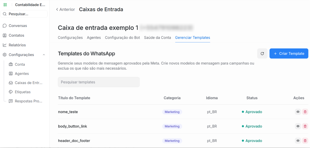 Na sequência, você será redirecionado a interface de gerenciamento da caixa de entrada. Clique no menu Gerenciar Templates.