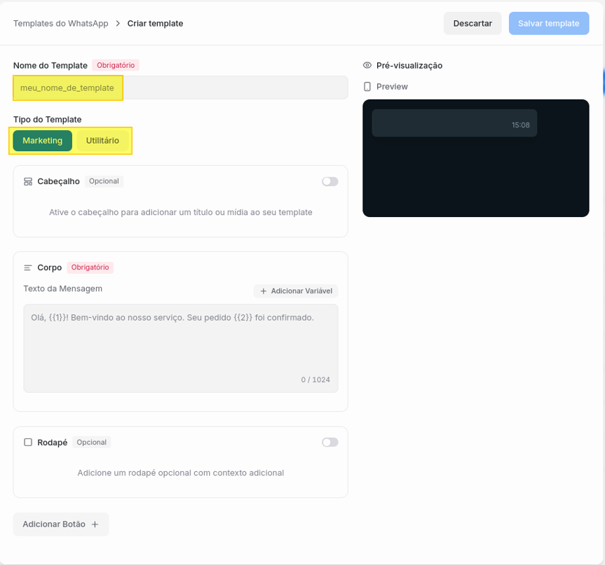Em seguida, você deverá escolher o tipo de mensagem. Sempre tente o tipo Utilitário pois ela tem um custo menor que o tipo Marketing.