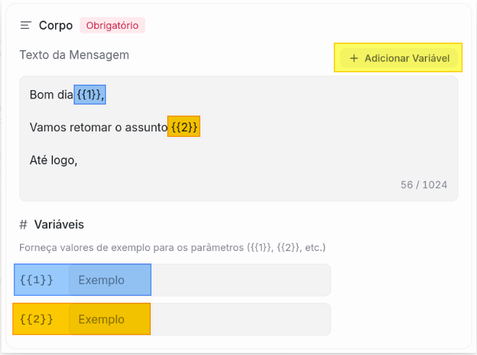 No corpo da template, você escreverá o texto da mensagem, e você poderá adicionar variáveis que poderão ser informadas no momento do envio do template na conversa. Para adicionar uma variável, você pode clicar no botão + Adicionar Variável.