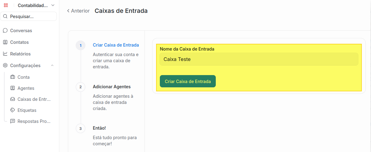 Agora você pode clicar em Configurações/Caixas de Entrada no menu lateral esquerdo para visualizar a nova caixa criada.
