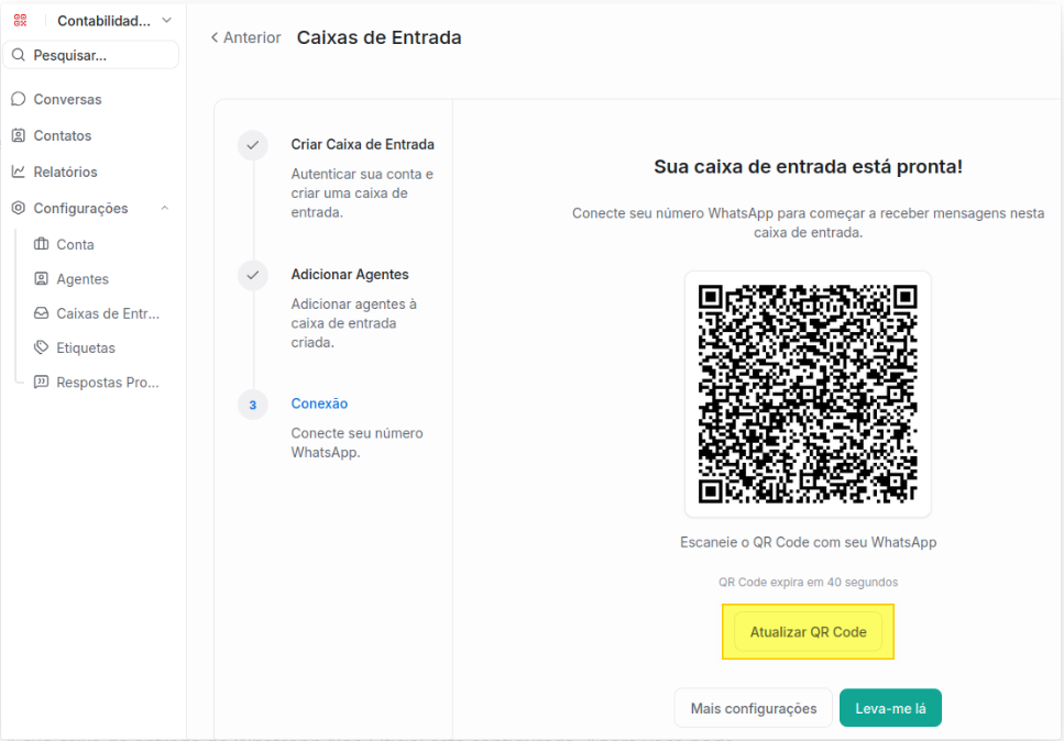 Pronto! A sua caixa de entrada de Whatsapp Não Oficial está configurada. Agora você pode clicar em Configurações/Caixas de Entrada no menu lateral esquerdo para visualizar a nova caixa criada.