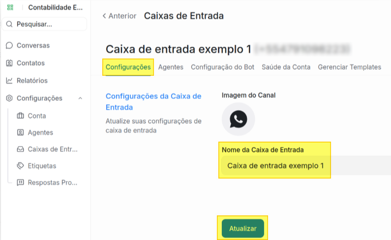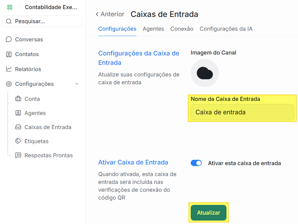 Para modificar o nome da caixa de entrada você deve selecionar o menu Configurações, modificar o nome da caixa de entrada e clicar em Atualizar.