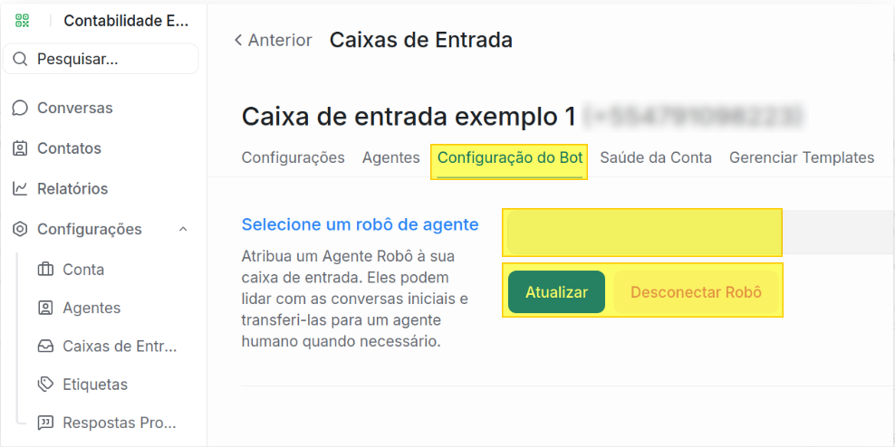 Para ativar/desativar o atendimento IA no nível da caixa de entrada, você deve selecionar o menu Configurações do Bot, selecionar o robô e depois clicar em Atualizar para ativar o atendimento IA. E caso você deseje desativar a IA, você deve clicar em Desconectar Robô.
