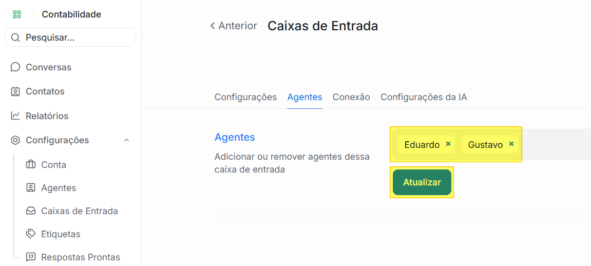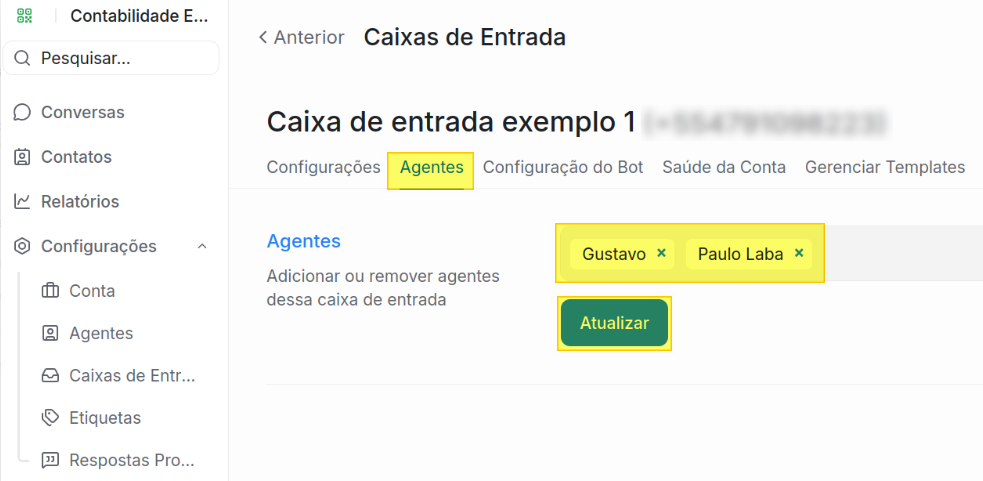 Para modificar os agentes que tem acesso a essa caixa de entrada, você deve acessar o menu agentes modificar a seleção dos agentes e depois clicar em Atualizar.