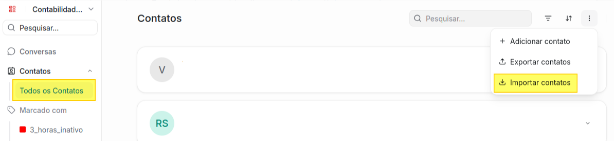 Para importar contatos em lote você deve clicar no menu lateral esquerdo em Contatos > Todos os Contatos.
