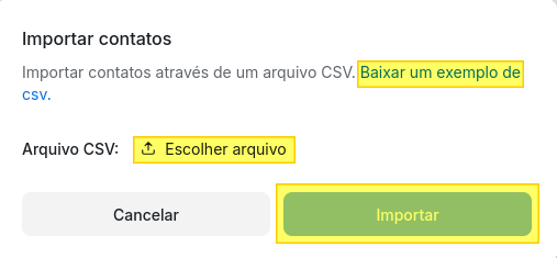 Clique em Baixar um exemplo de csv para obter a planilha csv modelo para preenchimento dos contatos que deseja importar