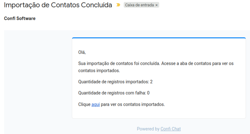 O Confi Chat poderá levar até 10 minutos para importar todos os contatos, após a finalização você receberá um email com as estatísticas da importação.