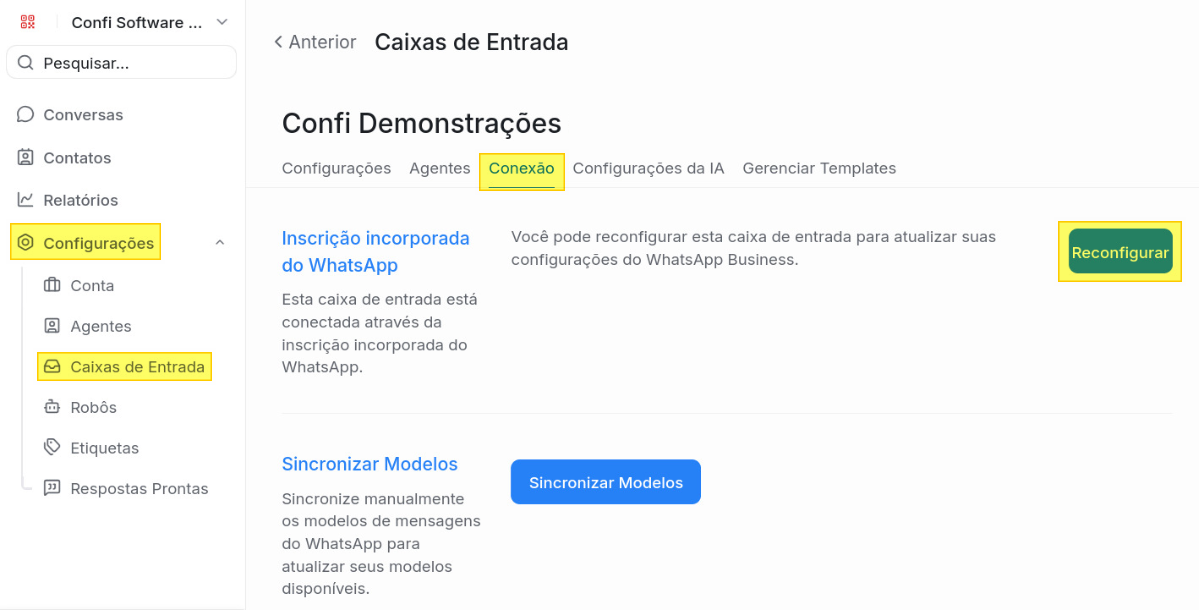 No seu painel do Confi, acesse o menu lateral em Configurações > Caixas de Entrada. Selecione a caixa do WhatsApp desejada e clique na aba Conexão.