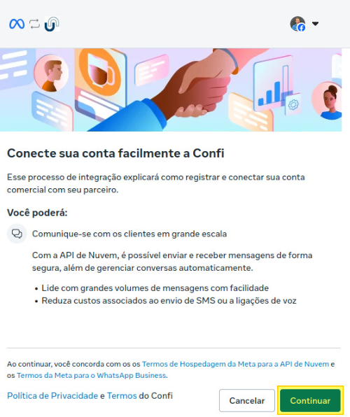 Clique em Continuar para autorizar a integração entre a API de Nuvem da Meta e a Confi.