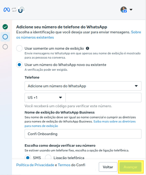 Conta do WhatsApp Business: Selecione a conta correspondente ao número que deseja utilizar.